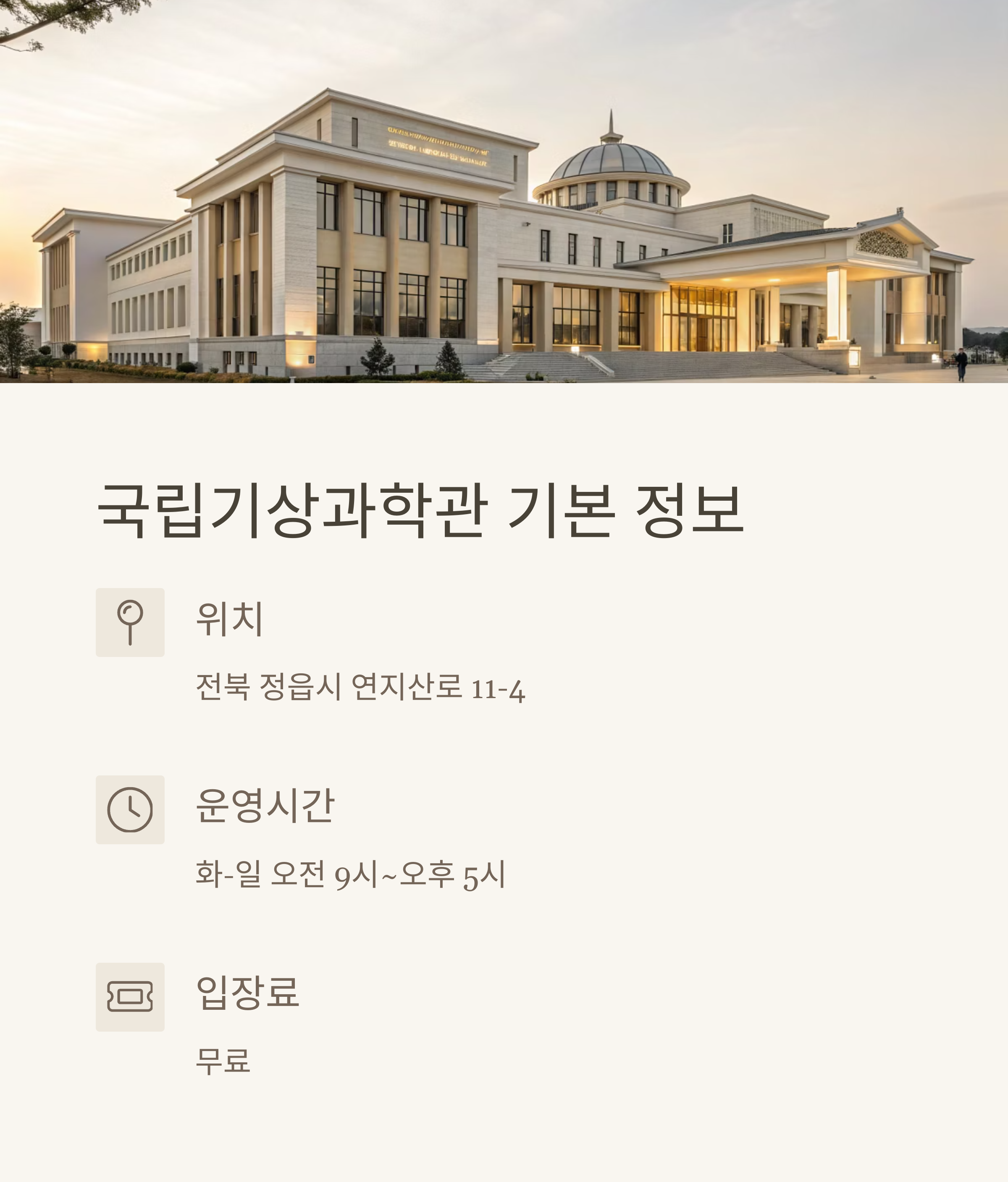 정읍 국립기상과학관은 무료로 운영되어 부담 없이 방문 가능합니다.